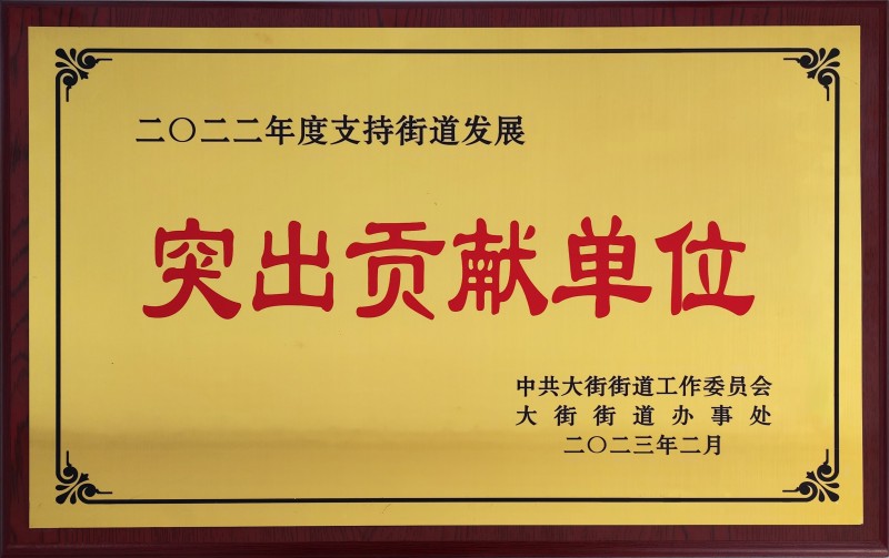 因我司在2022年度的卓越表現(xiàn),中共大街街道工作委員會特此頒發(fā)“突出貢獻(xiàn)單位”以茲鼓勵!