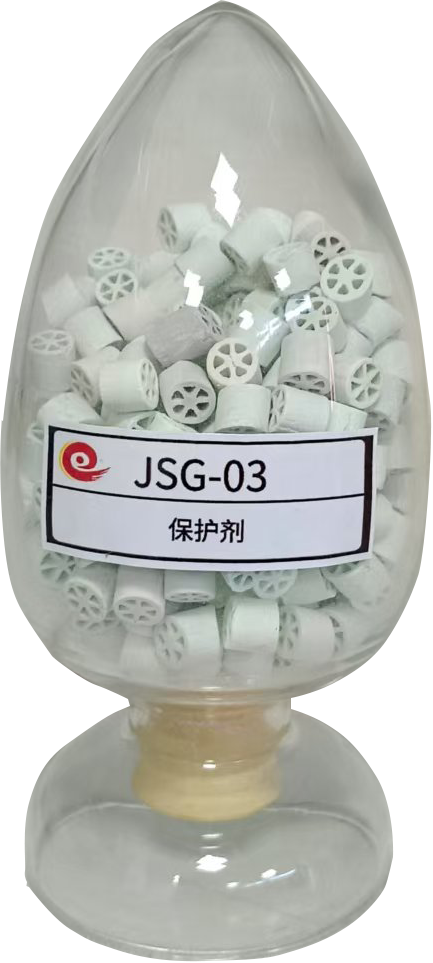 JSG-03保護劑為拉西環高金屬含量保護劑。JSG-03保護劑是在高孔容大比表面積異形載體上負載優選的活性金屬組元,可對原料中的膠質和烯烴以及稠環芳烴、金屬進行轉化和加氫飽和,達到防止壓降上升、延長運轉周期、脫膠質、保護主催化劑的目的。